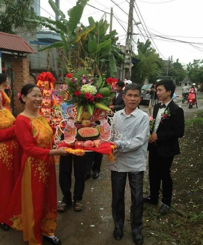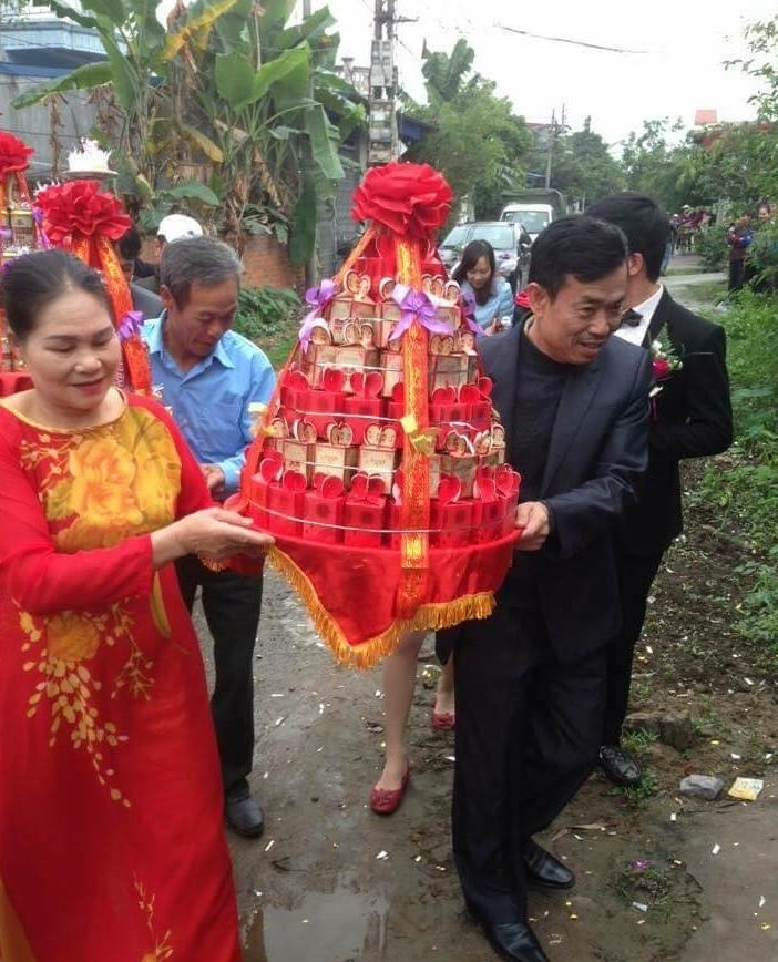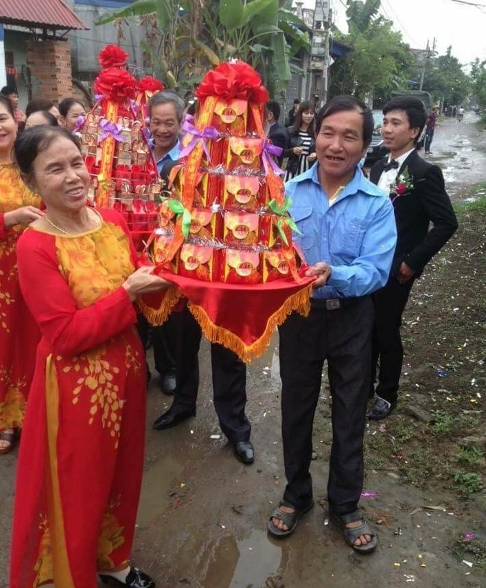Cô dâu Thu Hiền cho biết, đội hình bê tráp đều là người trong họ hàng, làng xóm được chính cô đích thân mời đến giúp. "Từ trước tới nay, phong tục bê và đỡ tráp ăn hỏi thường gửi gắm nhiều sự may mắn, chúc phúc. Nhưng hầu như các đám cưới bây giờ đều phải đi thuê người bê và đỡ tráp. Phong bao lì xì phải nhiều tiền trong khi phong tục này chỉ mang ý nghĩa tượng trưng, may mắn. Vì vậy mình quyết định nhờ người thân, hàng xóm. Đội bê tráp của mình hầu hết đều là giáo viên, nông dân… Nhưng các bác đều đã nhà cửa êm ấm, con cháu đủ đầy, cuộc sống sung túc. Mình cảm thấy như vậy sẽ tốt hơn".