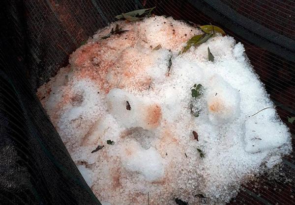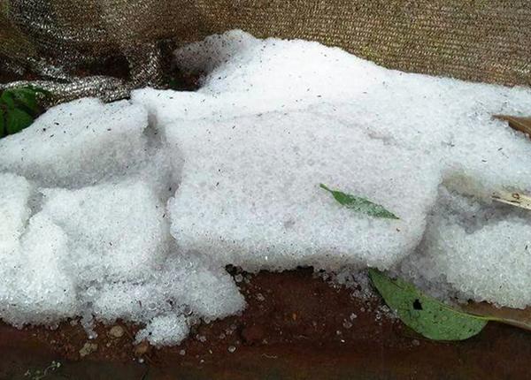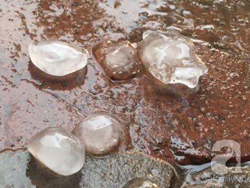 Những viên đá lớn, to bằng ngón tay út đổ xuống, chảy dồn về một phía, đọng lại thành từng tảng lớn. Đến sáng sớm ngày 24/4, những tảng băng đá này vẫn chưa kịp tan hết.