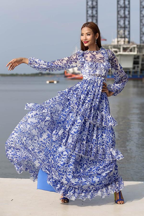 Chiếc váy voan mềm mại với họa tiết bắt mắt khiến huấn luyện viên tôn lên vẻ đẹp bay bổng, thể hiện đúng tinh thần thử thách thứ hai của tập 5. Chiếc váy đủ nổi bật nên chân dài chọn tóc buông xõa, toát lên gương mặt sắc nét.