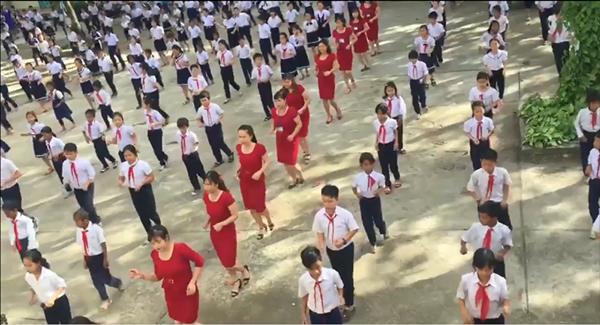 Bên cạnh, một hàng giáo viên mặc váy đỏ cũng nhảy cùng các em học sinh vô cùng duyên dáng và không kém phần đáng yêu. Cô Mai Hạnh chia sẻ, đây là hoạt động diễn ra thường xuyên của nhà trường trong các giờ ra chơi. Cứ mỗi thứ 2 và thứ 4, học sinh toàn trường từ khối 1 đến khối 5 sẽ được nhảy tập thể như thế này.