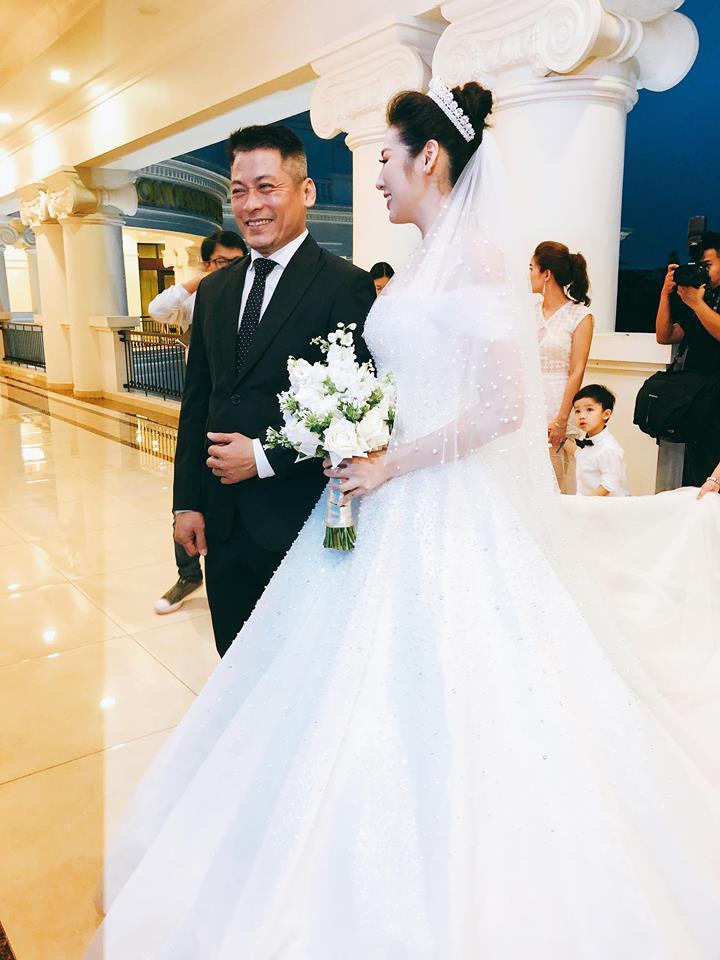 Cô dâu Tú Anh khoác tay cha cười rạng rỡ trước khi bước vào lễ đường