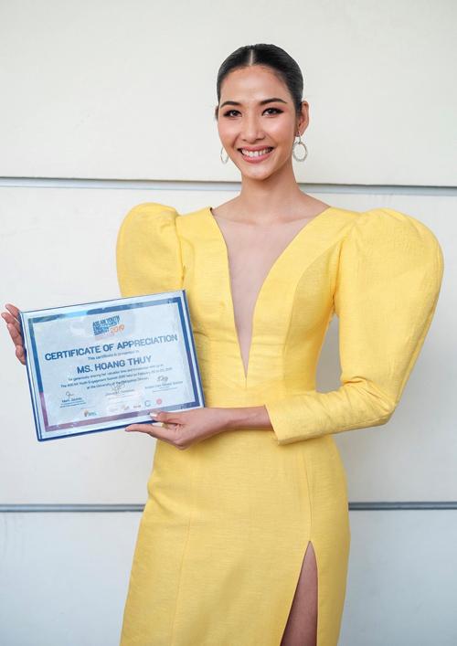 Á hậu Hoàn vũ Hoàng Thùy tham gia sự kiện ở Philippines với bộ cánh màu vàng nổi bật, tôn lên làn da rám nắng. Tuy nhiên kiểu dáng với phần tay bồng to của nó lại gây tranh cãi. Bộ đầm như "nuốt chửng" thân hình mảnh mai của Hoàng Thùy. Kết hợp cùng kiểu tóc và cách trang điểm nhợt nhạt, Á hậu có phần kém sắc hơn thường lệ.