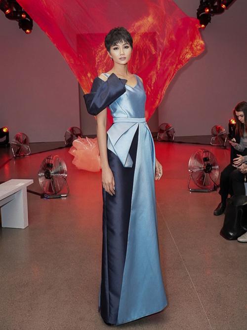 Khán giả vốn đã quen thuộc với hình ảnh H'Hen Niê trong những bộ váy ôm sát tôn đường cong nóng bỏng, màu sắc nổi bật nổi bật làn da nâu. Vì thế khi diện đầm màu xanh pastel với nhiều chi tiết rườm rà, Hoa hậu Hoàn vũ Việt Nam 2017 trông kém ấn tượng.