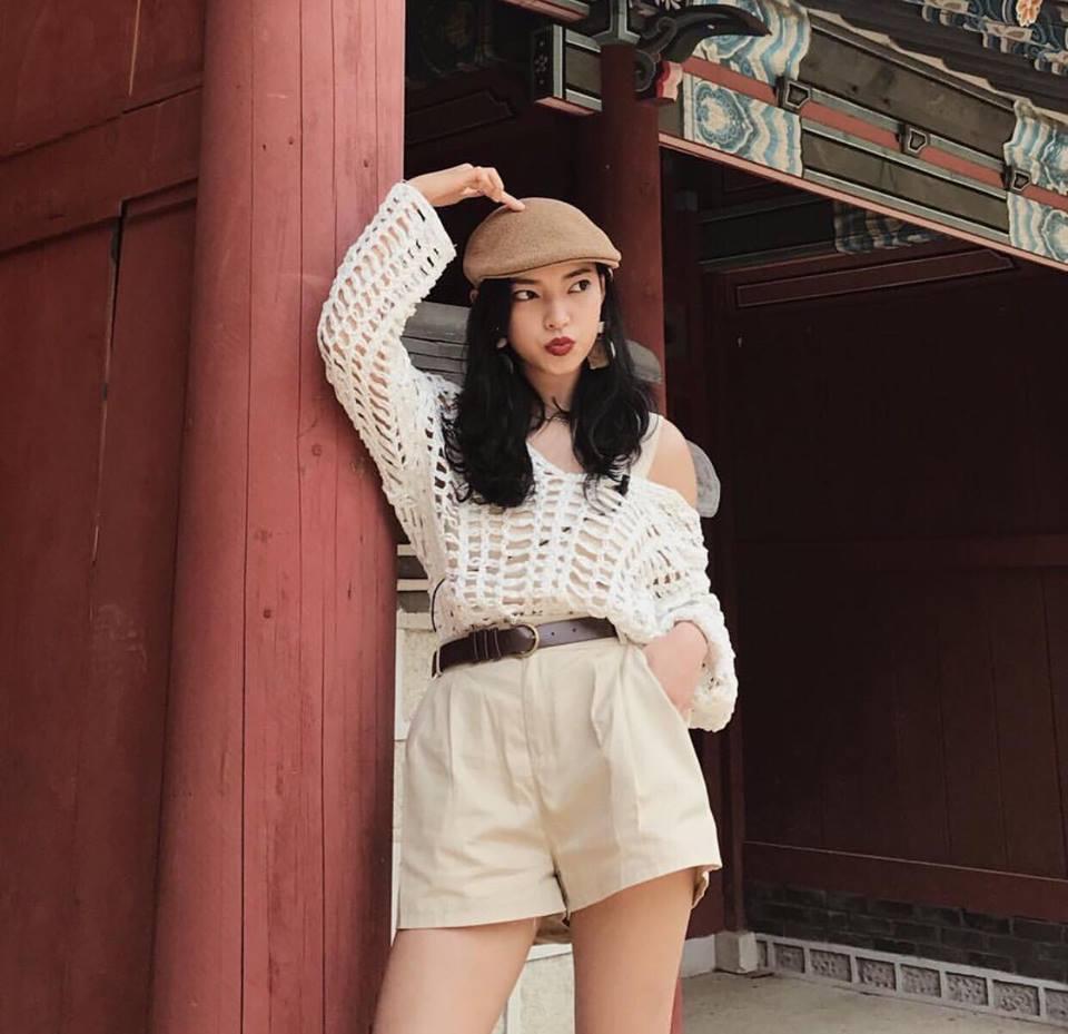 Cô nàng lựa chọn áo móc len trễ vai hững hờ mix cùng short cạp cao thả dáng trên đường phố Hàn Quốc