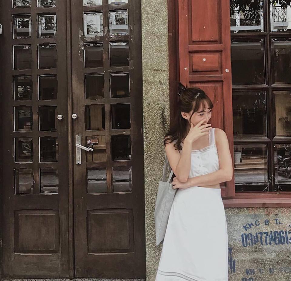 Sun Ht lựa chọn set đồ trắng với áo crop top cùng chân váy midi trong steet style tuần này. Cô nàng không quên khoác thêm chiếc túi vải Tote tiện dụng.
