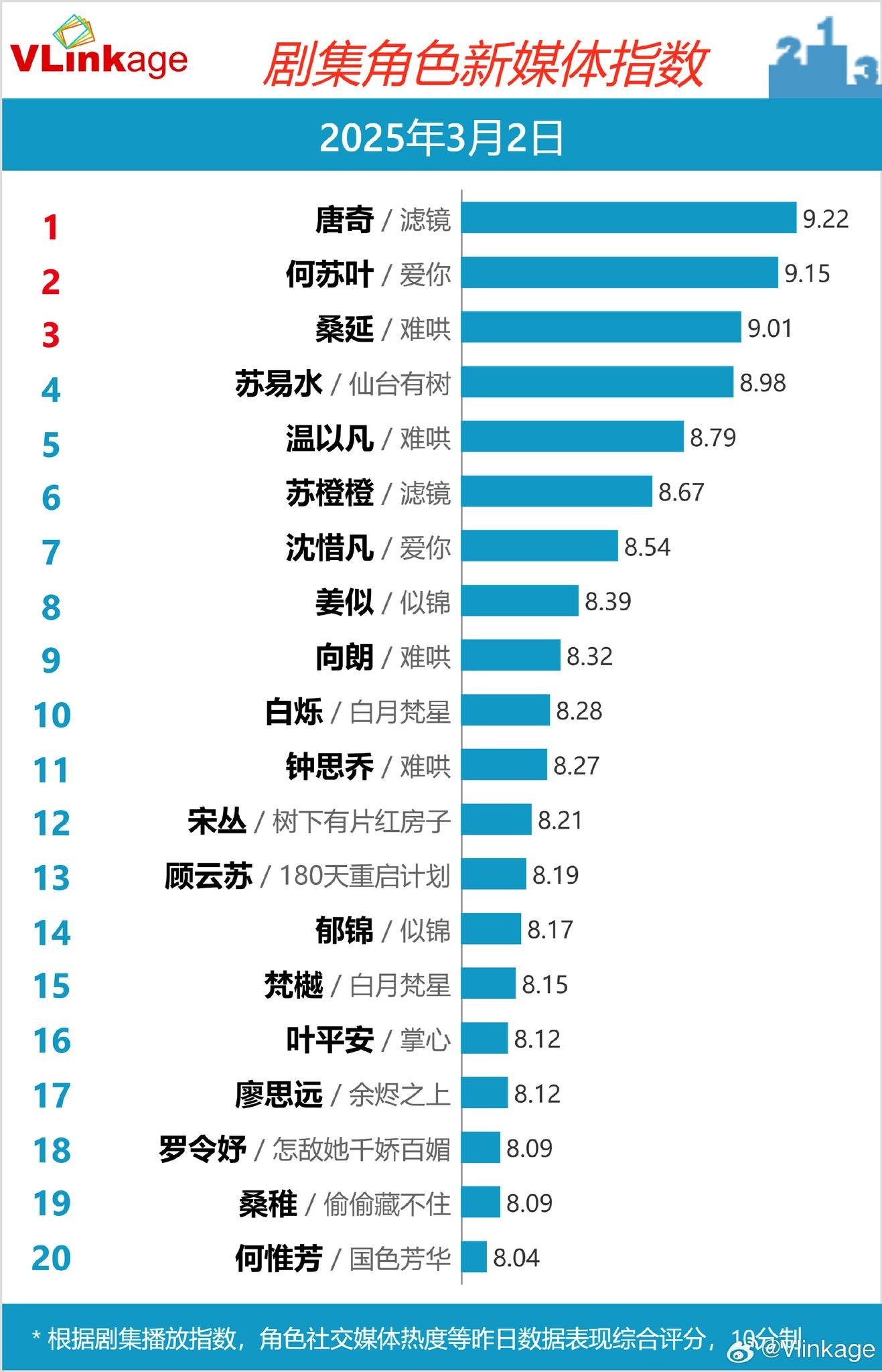 Thống kê ngày 2/3 cho thấy nhân vật Đường Kỳ của Đàn Kiện Thứ dẫn đầu bảng Vlinkage với điểm số lên tới 9.22 - một con số ấn tượng. Trong khi đó, nhân vật Hà Tô Diệp của Trương Lăng Hách đứng ở vị trí nhì bảng với 9.15 điểm. Đứng thứ ba là Tang Diên của Bạch Kính Đình với 9.01 điểm.
