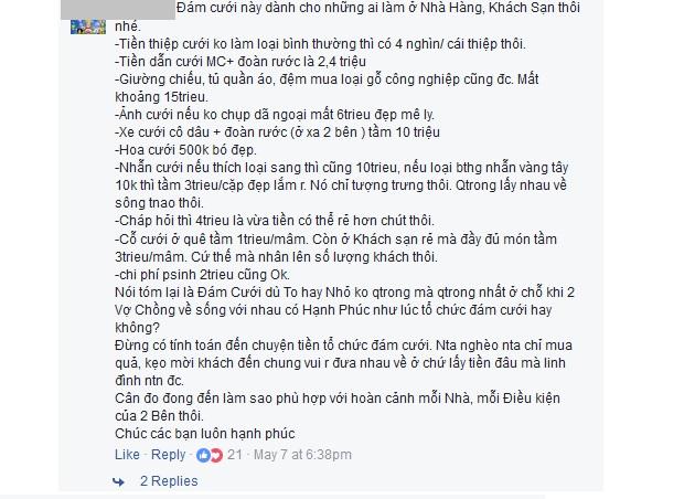 Tổng kinh phí dự trù là hơn 169 triệu đồng. Theo chia sẻ của chủ nhân post thì: "Đây mới là tính sơ qua thôi, thực tế bày vẽ ra có thể gấp đôi". Các chàng thấy sao nhỉ?