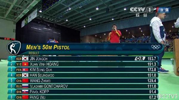 Vòng chung kết nội dung Bắn súng ngắn nam 50m ở Olympic Rio 2016 đã khép lại, nhờ vào cú lội ngược dòng hai phát súng cuối, tuyển thủ Hàn Quốc Jin Jong Oh đã phá kỷ lục Olympic với 193,7 điểm, giành huy chương vàng. Lão tướng Việt Nam Hoàng Xuân Vinh đạt được huy chương bạc. 2 tuyển thủ Trung Quốc là Vương Trí Vĩ và Bàng Vỹ lần lượt giành vị trí thứ 5 và thứ 8.