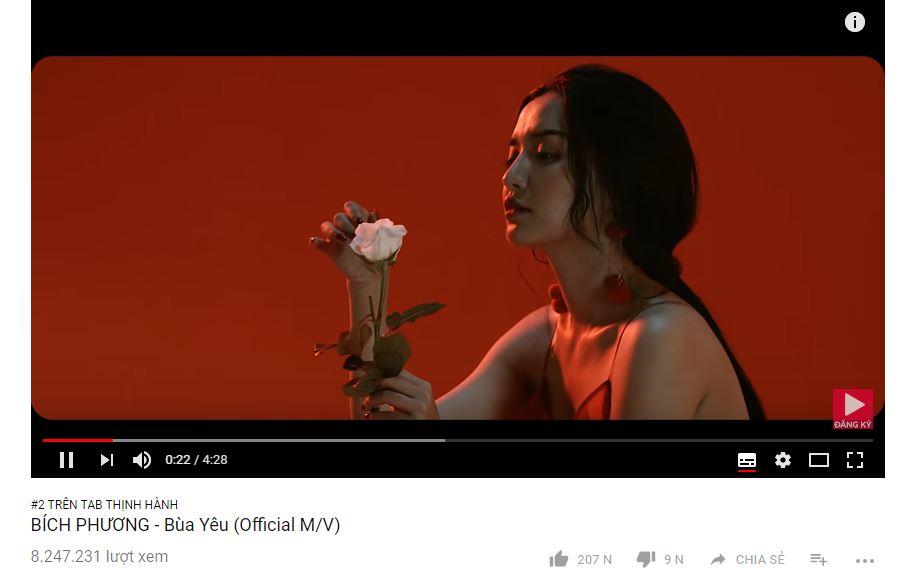 Sau 2 ngày phát hành, MV Bùa yêu đã thu về hơn 8 triệu lượt xem trên Youtube và giữ vững vị trí thứ 2 trên tab thịnh hành. Hit mới của giọng ca Bao giờ lấy chồng còn lọt vào top xem nhiều nhất trong vòng 24 giờ xuất hiện. Đây là thành công bước đầu của MV Bùa yêu cũng như Bích Phương khi phát hành vào thời điểm nhiều nghệ sĩ khác cùng tung sản phẩm mới.