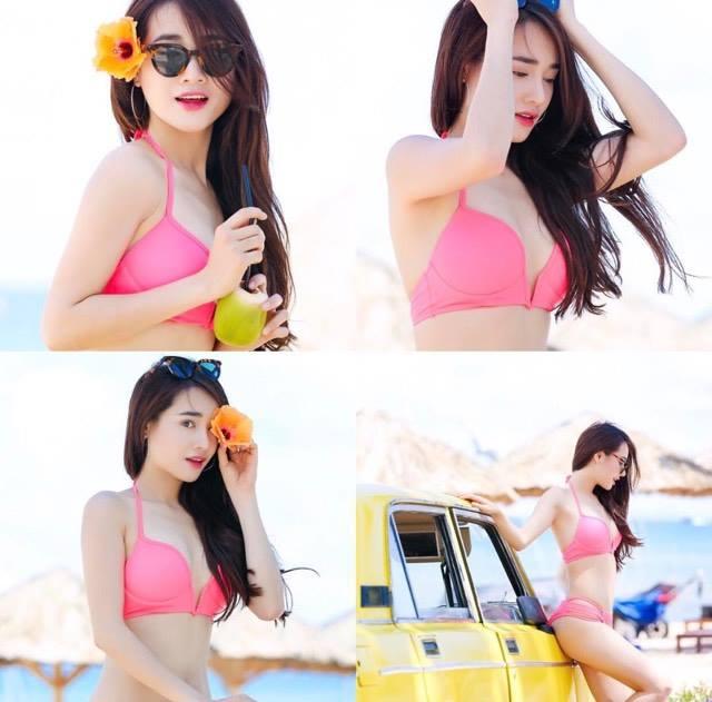 Nữ diễn viên Nhã Phương chọn bikini màu hồng để làm nổi bật làn da trắng muốt và thân hình gợi cảm.