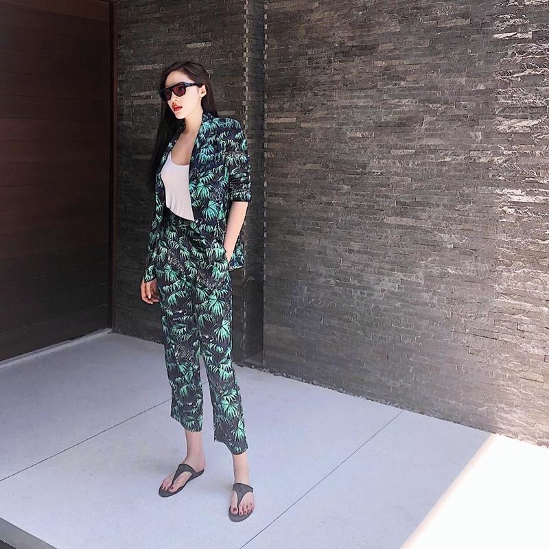 Kỳ Duyên mang phong cách cá tính không kém phần nữ tính trong bộ suit họa tiết bắt mắt.