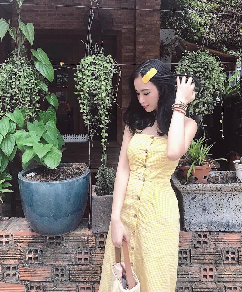 Vàng là một trong những gam màu được dàn mỹ nhân Việt lăng xê nhiều nhất hè này. Angela Phương Trinh đi đầu xu hướng với chiếc váy họa tiết caro sắc vàng nhẹ nhàng cùng điểm nhấn là phụ kiện kẹp tóc đồng điệu.