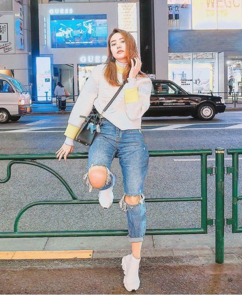 Minh Hằng tự tin thả dáng trong outfit áo sweater mix quần jeans rách gối.