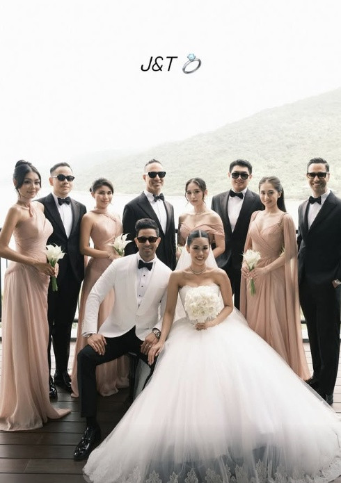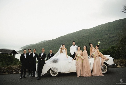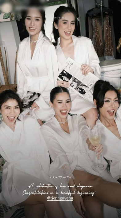 Dàn phù dâu, phù rể toàn những cái tên đình đám như Á hậu Thảo Nhi Lê, em trai Hiếu Nguyễn và Marie Trâm Anh - bạn gái Hiếu Nguyễn. Dàn phù dâu diện váy tông màu hồng nude, trong khi đó dàn phù rể diện vest bảnh bao.
