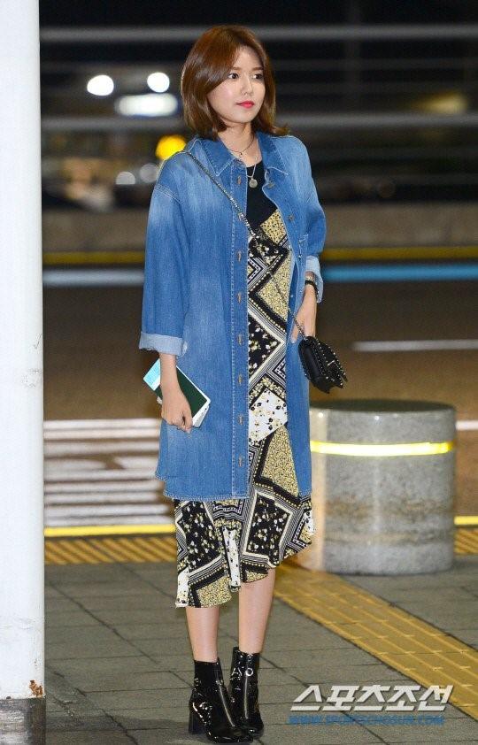 Sooyoung sành điệu như mọi khi, màu son đỏ nổi bật giúp gương mặt tươi tắn.