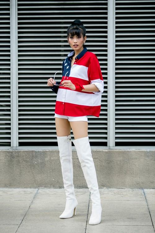 Trương Thị May khoẻ khoắn xuống phối với áo sơ-mi sọc đỏ trắng. Đôi boots trắng cao quá đầu gối mang đến