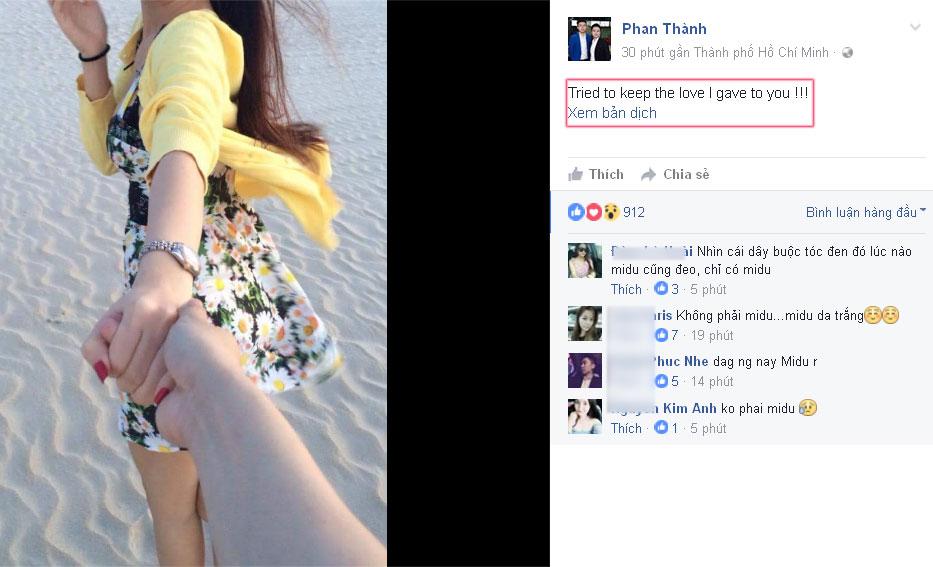 Sau dòng chia sẻ và clip hát ca khúc "Tỉnh mộng" cách đây không lâu nhiều người đồn đoán rằng Phan Thành đã buông xuôi và không còn muốn níu kéo chuyện tình cảm với Midu. Tuy nhiên mới đây nhất thiếu gia Sài Thành lại đăng ảnh nắm tay người con gái giấu mặt khiến dân tình lại thêm xôn xao. Cùng với hình ảnh này Phan Thành viết: "Tried to keep the love I gave to you" (Tạm dịch: Đã cố gắng giữ tình yêu em dành cho anh.)