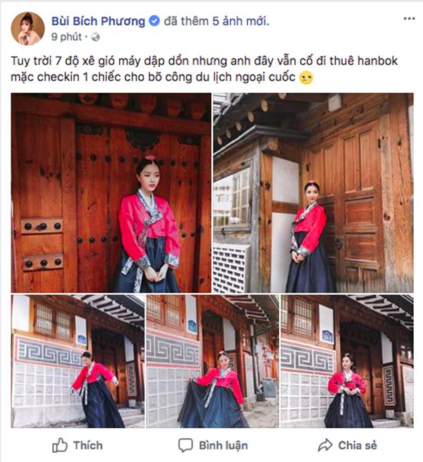 Theo đó, nữ ca sĩ chia sẻ dòng trạng thái: "Tuy trời 7 độ xê gió máy dập dồn nhưng anh đây vẫn cố đi thuê hanbok mặc checkin 1 chiếc cho bõ công du lịch ngoại quốc”. Ảnh đẹp là thế nhưng cô lại bất ngờ bị 1 người hâm mộ tố: “Kéo chân hơi dài nha anh… Em báo công an”.