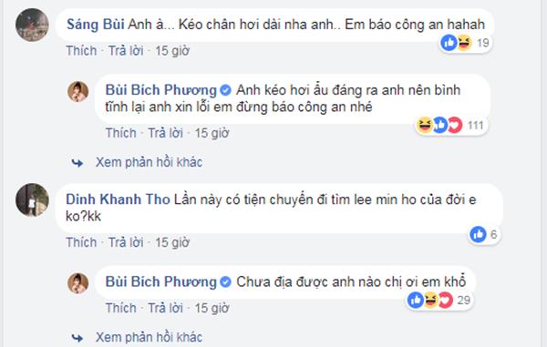 Chưa dừng ở đó, Bích Phương lại bị fan công kích bằng một loạt các câu hỏi mang đậm chất dìm hàng: “Lần này có tiện chuyến đi tìm Lee Min Ho của đời em không?”, “Cả Idol dồn về Hàn Quốc”… Bích Phương vẫn kiên nhẫn đáp trả từng bình luận một cách vui vẻ khiến cư dân mạng vô cùng thích thú.