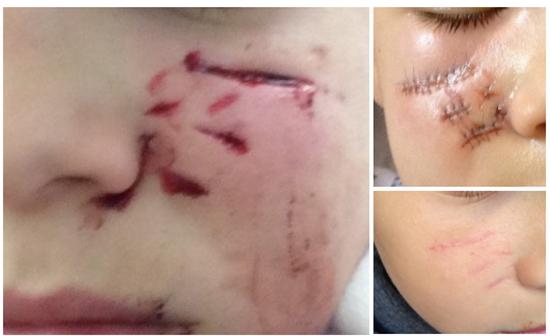 Cậu bé này sang nhà bạn chơi với con trai anh Harris, trong khi đang ngồi ở ghế sofa để chụp ảnh selfie cùng bạn thì bất ngờ con chó dòng husky nhà Harris nhảy lên và cắn thẳng vào mặt. Vì vết thương quá lớn không thể tự sơ cứu được nên ngay lập tức người nhà đã đưa cậu bé nhập viện. Vết rách to đến mức phải khâu 21 mũi nhưng vết thương tinh thần thì còn trầm trọng hơn.
