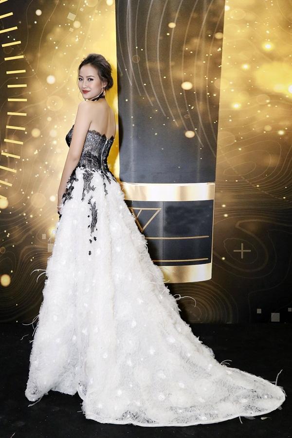 Diện đầm xòe đuôi cá cúp ngực, Khánh Ngân khoe được hết lợi thế cơ thể của mình. Kiểu tóc chải ngược cũng giúp cô có được gương mặt sáng, ăn hình.
