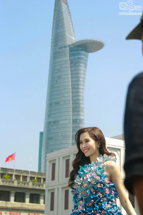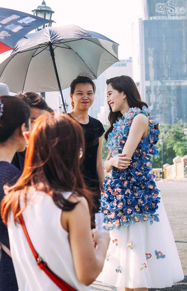 Diện chiếc váy được kết hoa lan khá kỳ công, người đẹp sinh năm 1991 khiến nhiều người đi đường phải ngoái lại nhìn khi cô đang thực hiện những shot hình trên Cầu Mống. Không ít khán giả nhận ra Đặng Thu Thảo còn dừng xe để xin chụp một số tấm hình kỷ niệm và chữ ký của hoa hậu.