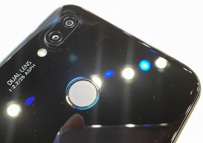 Cũng ở mặt sau, máy có một cảm biến vân tay siêu nhạy. Cảm biến này được thiết kế hình tròn và được đặt ở vị trí rất tiện sử dụng với ngón tay trỏ hoặc ngón giữa. Tương tự, cách Huawei thiết kế ở mặt trước cho nova 3e cũng không có điểm chê khi màn hình khả dụng tràn viền bao phủ phần lớn bề mặt, kèm với dòng chữ Huawei nhỏ nhắn ở cạnh dưới và “tai thỏ” tinh tế ở cạnh trên. Ở ngay vị trí khoét tai thỏ là cảm biến ánh sáng, loa trong và camera trước.