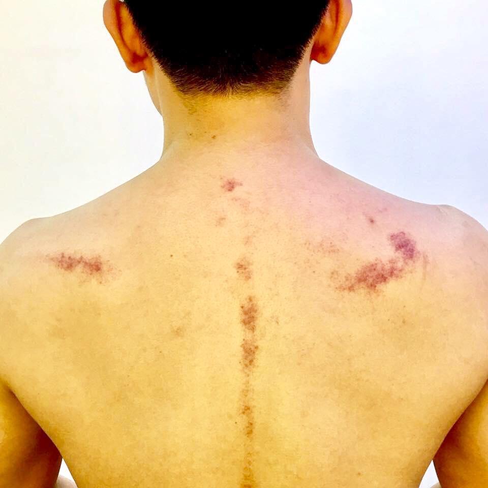 "Ta nói... đi làm về mệt, kêu bà vợ cạo gió giùm, xong mệt quá ngủ luôn, sáng dậy đâu có biết nó cạo ra sao đâu? Cái...... đi quay chương trình, thay đồ, bà Cẩm Ly la lên: 'Thành ơi, đâu ai cạo gió mà cạo ngay cột sống đâu, dễ chết lắm đó, ai cạo vậy'? Mọi người có câu trả lời rồi ha! Trời ơi, nó cạo cái cột sống của tôi như cái cột sóng điện thoại tôi không nói. Hai bên kia, thường người ta cạo xuống theo hình dấu huyền. Không... nó thích dấu sắc, cạo đá lên được không? Má ơi, chụp cái lưng lại không tin vào mắt mình luôn. Đâu ai nói cạo gió, tưởng bị mèo quào không à. Bó tay con Heo", Trấn Thành hào hứng bật mí.