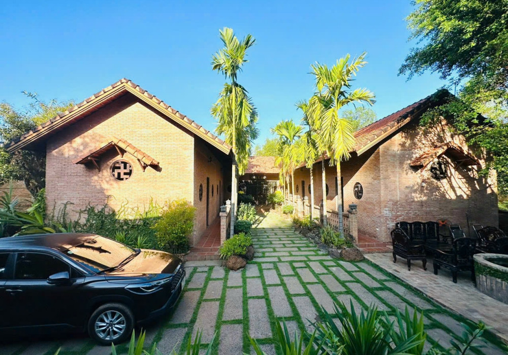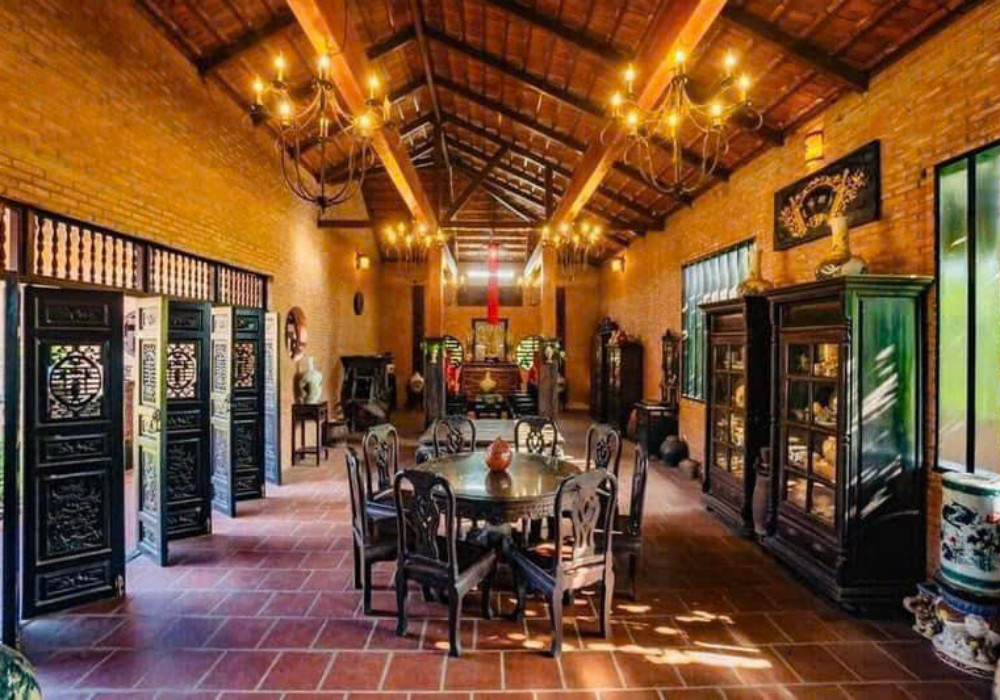 Nhà được xây dựng theo không gian cổ xưa nên vách tường, nền nhà được lát bằng gạch, các cột và cửa là các loại gỗ quý như lim, huỳnh đàn...