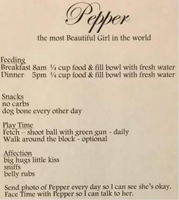 Tờ ghi chú những yêu cầu khi chăm sóc Pepper - cô gái xinh đẹp nhất thế giới