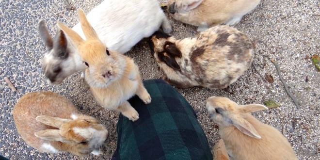 Bạn có thể mua một túi thức ăn cho thỏ ở bến phà và chuẩn bị tinh thần đón những chú thỏ trèo lên chân, lên người bạn để xin ăn. Tầm mắt của thỏ ở Okunoshima khá thấp, bạn nên thả thức ăn xuống đất hoặc đeo găng và cho chúng ăn trong tay. Ảnh: Marriott.