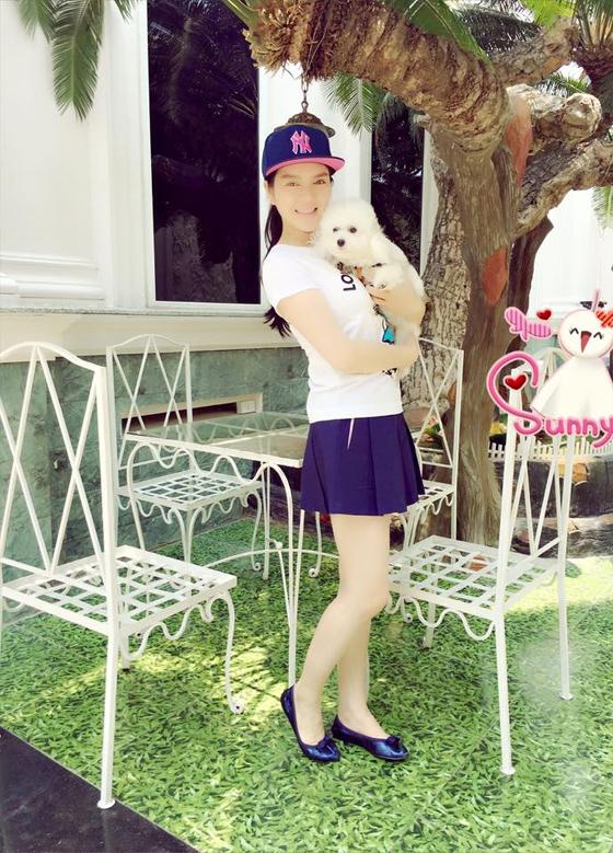 Với váy xòe mini, Lý Nhã Kỳ kết hợp với áo phông, giày búp bê dễ thương.