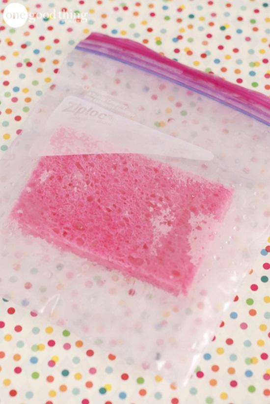 Bạn không có đá nhân tạo để bỏ vào những thùng đá chứa thực phẩm? Không sao, hãy áp dụng cách này. Cắt bọt biển thành 3 đến 4 phần, nhúng vào nước, bỏ vào túi nhựa rồi cất vào tủ lạnh. Lúc này, chúng sẽ đóng vai trò như đá nhân tạo, giúp giữ nhiệt cho thực phẩm đựng trong thùng đá.