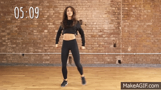 Vừa di chuyển vừa gập bụng theo nhạc. Động tác này giúp bạn có vòng eo thon lẫn cơ bụng săn chắc.