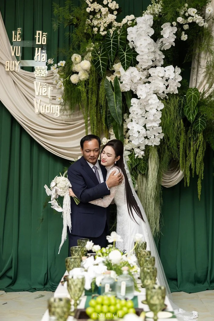 Kèm theo đó, cô đăng bức hình sau khi được bố ruột dắt tay lên sân khấu và trao cho chàng rể quý. Bóng lưng của ông Đỗ Văn Tào luôn dõi theo con gái khiến nhiều người không khỏi xúc động.