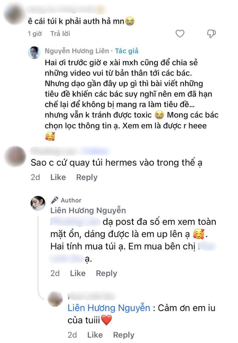 Tuy nhiên, việc người đẹp liên tục chụp hình quay túi Hermès vào trong khiến cô vướng nghi vấn dùng túi nhái. Dù Hương Liên sau đó đã lên tiếng giải thích: “Em cảm ơn chủ status đã dành sự yêu thương cho em. Nhưng mong sau này sự quan tâm đó sẽ đúng với mục đích bài post của em, khen mặt và dáng em thôi ạ. Em chỉ buồn cười quá là khăn của mẹ em che nắng lên đâu cũng thấy giật là khăn Hermès với các giá sản phẩm đang độn cao quá ạ”.