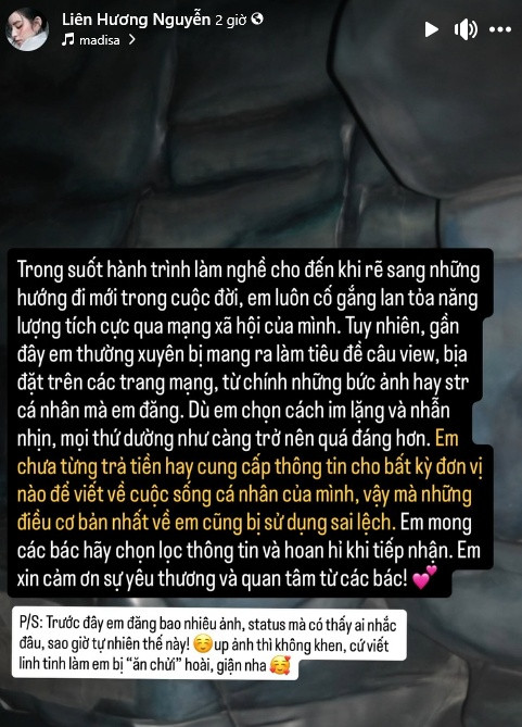 "Trong suốt hành trình làm nghề cho đến khi rẽ sang những hướng đi mới trong cuộc đời, em luôn cố gắng lan tỏa năng lượng tích tực qua mạng xã hội của mình. Tuy nhiên, gần đây em thường xuyên bị mang ra làm tiêu đề câu view, bịa đặt trên các trang mạng, từ chính những bức ảnh hay sroty cá nhân mà em đăng. Dù em chọn cách im lặng và nhẫn nhịn mọi thứ dường nhừ càng trở nên quá đáng hơn. Em chưa từng trả tiền hay cung cấp thông tin cho bất kỳ đơn vị nào để viết về cuộc sống cá nhân của mình vậy mà những điều cơ bản nhất về em cũng bị sử dụng sai lệch. Em mong các bác hãy chọn lọc thông tin và hoan hỉ khi tiếp nhận".