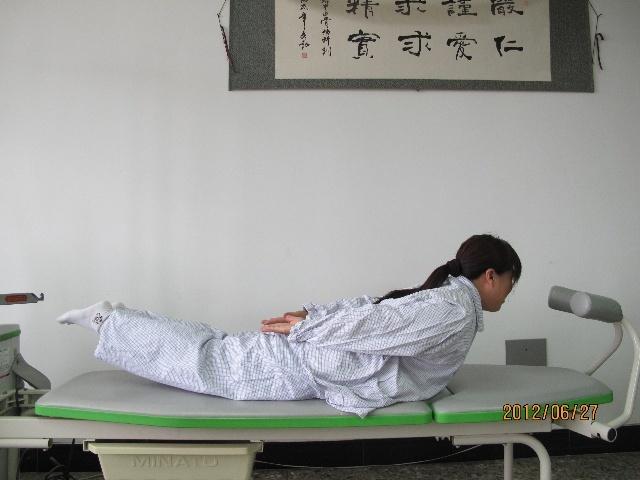 Nằm trên giường cứng hoặc mặt sàn, nơi bằng phẳng. Bụng úp xuống mặt sàn, nhẹ nhàng giơ cánh tay về phía sau lưng, cánh tay giơ cao dần lên theo khả năng, mỗi ngày một tăng độ khó lên.