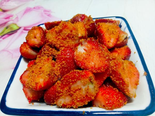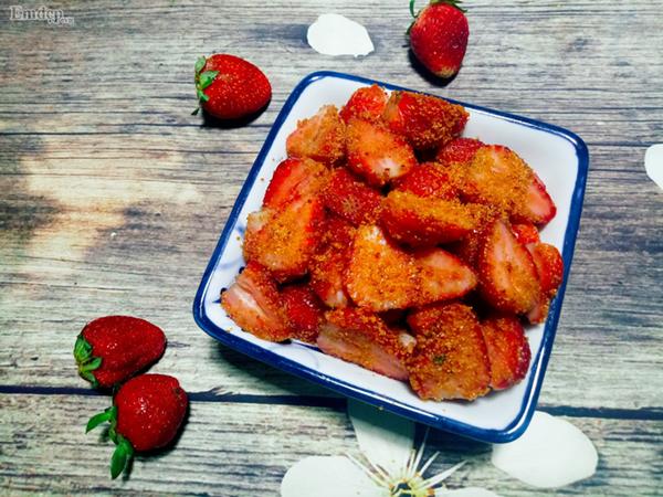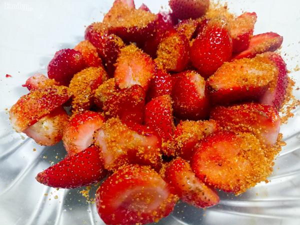 Cho muối tôm và đường vào dâu rồi lắc đều (có thể nêm lại theo khẩu vị vừa ý nhé).