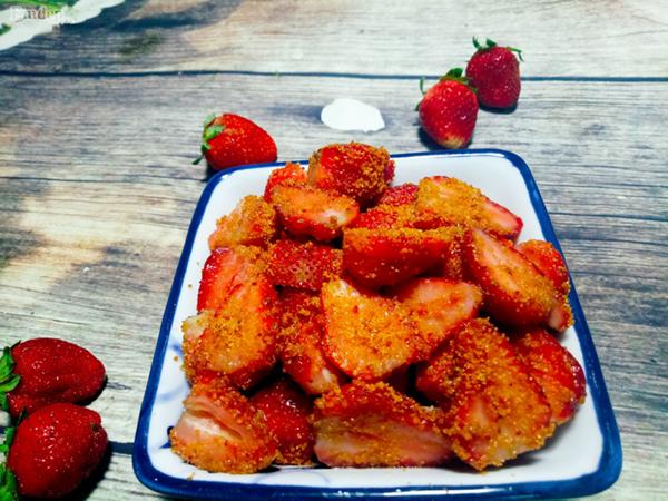 Dâu cắt hai hoặc để nguyên trái tuỳ thích. Chuẩn bị muối tôm và đường cát.