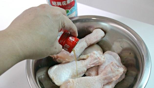 Gà mua về rửa sạch, để ráo sau đó ướp cùng 1 muỗng canh rượu nấu ăn.