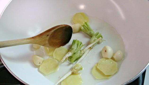 Vo gạo sau đó đặt một lớp lá dứa đã phết dầu ăn xuống đáy nồi rồi cho gạo vào. Bắc chảo lên bếp cùng chút dầu ăn sau đó cho rễ rau mùi, tỏi, gừng vào phi thơm.