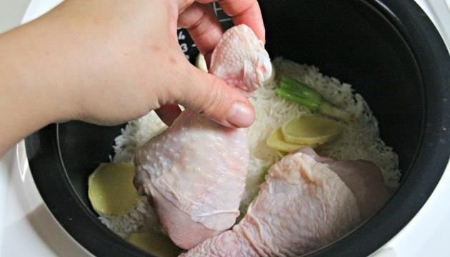 Đặt đùi gà lên nồi cơm và rót đầy nước dùng gà vào. Lượng nước dùng gà có thể dao động tùy vào loại gạo mà bạn sử dụng. Tiếp đến đậy nắp nồi cơm lại và nhấn nút Nấu (Cook), đến khi cơm chín, nồi cơm nhảy lên nút Hâm nóng (Warm) là món cơm gà đã hoàn thành rồi đấy!