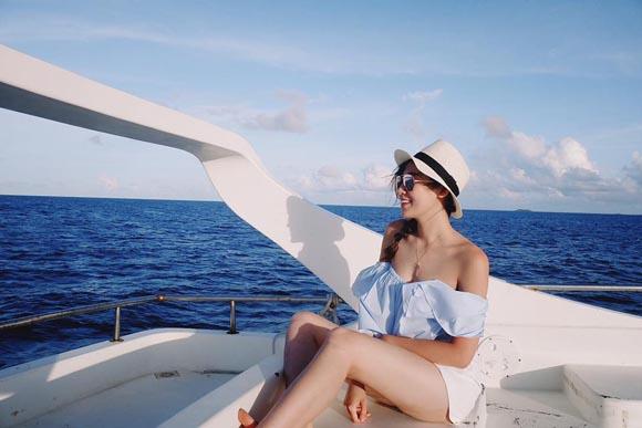 Á hậu Dương Tú Anh lại chọn cho mình cách phối trẻ trung năng động hơn khi kết hợp mũ Panama cùng item hot của năm nay là áo trễ vai và quần short trẻ trung