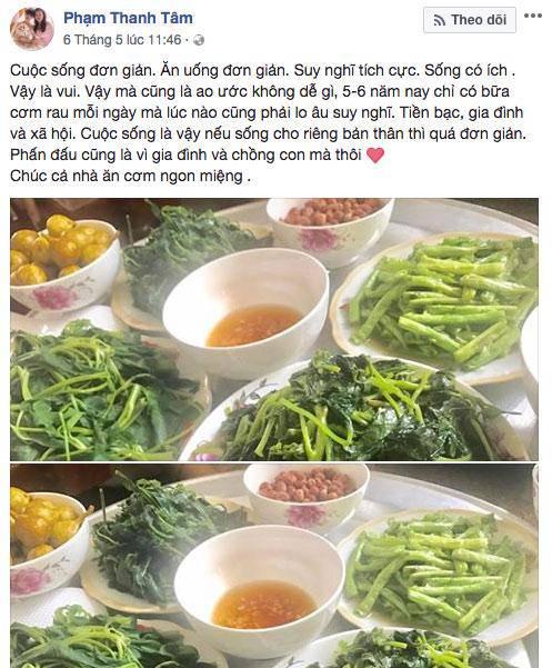 Mới đây, Thanh Tâm đăng tải trên facebook bức ảnh mâm cơm thường ngày của cô gái trẻ kèm lời chia sẻ "Cuộc sống đơn giản, ăn uống đơn giản" và ngay lập tức thu hút sự chú ý.