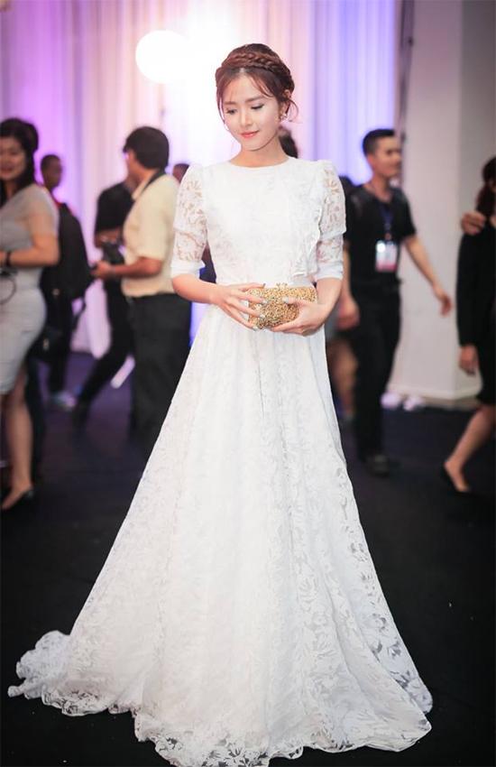 Với chiếc váy trắng dài thướt tha, Midu lựa chọn tóc tết vấn tạo nên diện mạo