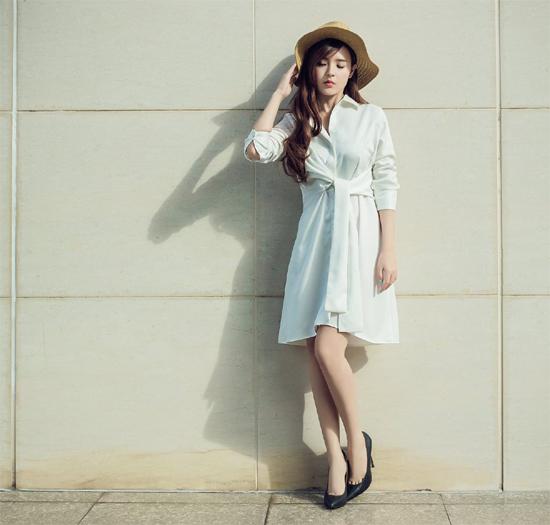 Midu diện chiếc váy trắng thắt eo kiểu cách phía trước kết hợp giày cao gót và mũ cói. Tất
