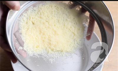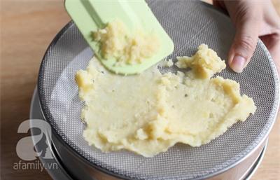 Khi nước trong nồi gần như cạn thì nhớ xới liên tục. Khi đậu mềm, có thể tán thành bột dễ dàng là được. Đợi nguội tí rồi tán đậu xanh cho mịn và lược bớt những hạt đậu chưa nở.