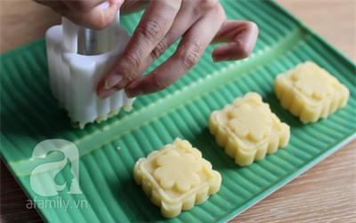 Cho viên đậu xanh vào khuôn, ấn đều tay và dứt khoát để hình bánh được sắc nét.