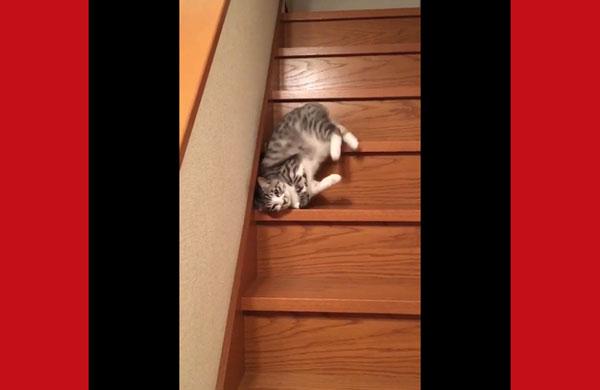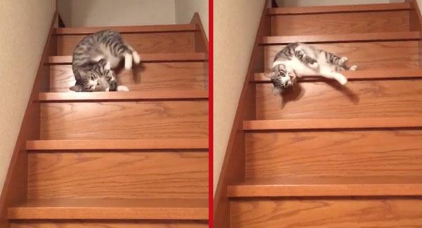 Một người dùng twitter ở Nhật Bản đã đăng tải một đoạn video mà một chú mèo trong lúc di chuyển cầu thang, đã cho thấy sự chây lười đến khó tin của mình. Không buồn nhấc thân người lên, cô mèo xảo quyệt chỉ dùng sức lực nhỏ nhất có thể, rướn phần trước cơ thể rồi trườn người từ bậc thang trên xuống bậc thang dưới.